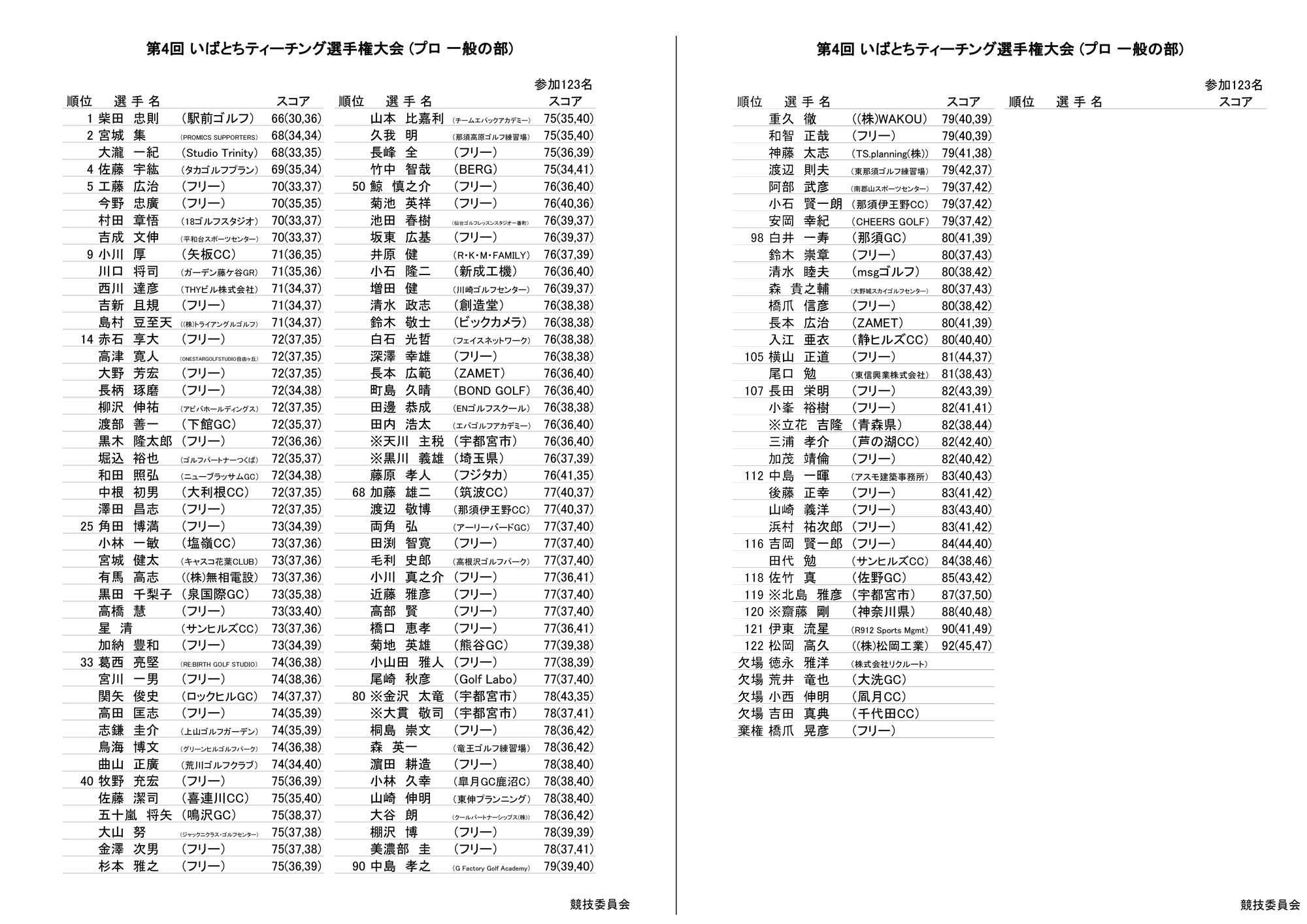 第4回いばとちティーチングプロゴルフ選手権 成績表